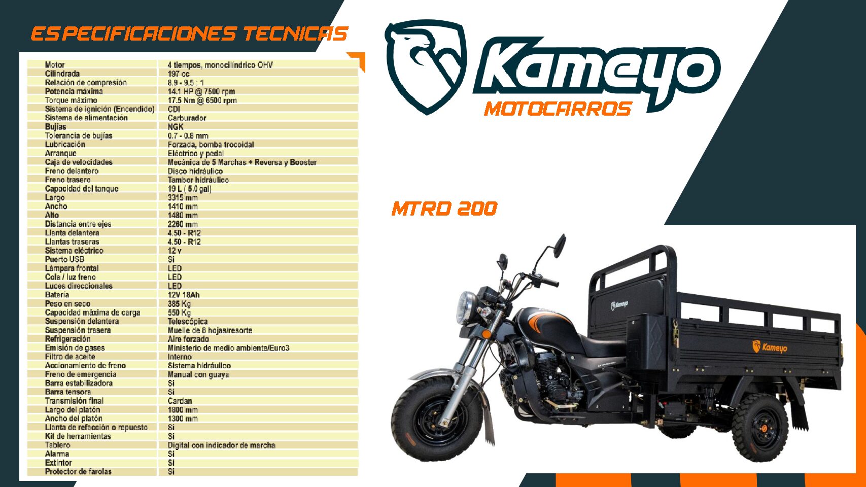Comodidad y Diseño Funcional: El MTRD 200 prioriza la comodidad del conductor. Su asiento ergonómico, panel de instrumentos funcional y encendido eléctrico y de pedal permiten un manejo cómodo, ágil y seguro. Diseñado con detalles prácticos, este motocarro combina eficiencia y confort en un solo vehículo.